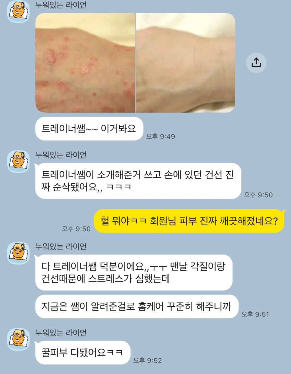 이 글은 트레이너인 내가 그깟 '건선' 하나 때문에 우울감에 시달려.. 회원 앞에 서는 게 두려워졌던 그 날의 실제 이야기다. 현재는 비싼 피부과의 도움 없이 건선 피부를 극복하고 매끈한 피부를 갖게 되었다. (지금도 계속 유지하는중) ↓ ↓ 심지어 나 말고도 같은 증상을 겪고있는 외삼촌 또한 내가 알려준 방법으로 3개월 만에 겪은 변화다.. ※미리 경고합니다. 이 글은 건선 피부로 인해 트레이너인 내가 자존감이 밑바닥까지 떨어지고 우울증까지 걸려서 내가 지난 7개월간 고군분투하며 알게된 방법을 공유하는 "순수 정보성 글이다" 3분이면 읽을 수 있도록 핵심 내용만 정리했는데 그동안 피부과, 약국에 파는 크림, 각종 건선 관련 제품 비용으로 수백만 원 이상 쓴 사람이라면 건선 피부의 진실을 밝히는 이 글이 다소 충격적이고 불편할 수 있다. "그동안 내가 속았구나..." 싶은 생각에 마음이 씁쓸할 수 있으니 평소 '모르는게 약'이라고 생각한다면 뒤로가기를 누르는걸 권장한다. 하지만, 1.건선피부 때문에 스트레스를 받고있거나 2.효과적인 개선 방법을 찾고있다면 이 글을 반드시 정독하길 바란다. <추가내용> 피부과, 제품 광고 등 내가 어떤 조건으로 홍보 요청이 와도 전화, 쪽지, 메일 모두 차단해버린다. 그러니 제발 좀 그만 연락하시길... 그럼에도 계속 연락한다면 이곳에 모자이크 없이 전체 내용을 공개하겠다. 마지막으로 분명히 경고한다. A 피부과에서 자꾸 연락하시는데 한번 더 연락하시면 상호명 공개하겠습니다.