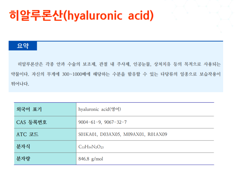 우레아로 각질을 정리 했으면 수분을 끌어당겨 공급시키고 피부에 머무르게 해줘야 한다. 이 역할을 해주는게 바로 히알루론산이다. 우레아로 각질만 정리하고 끝낸다면? 피부는 그 틈으로 수분을 잃고 건조, 붉어짐, 각질 재발까지 부를 수 있다. 우레아로 각질을 정리한 후, 수분 공급은 즉시 이어져야 한다. 히알루론산 없이 정돈된 피부는 속부터 갈라지기 시작한다. 각질 정리 후 수분 보충은 '선택'이 아니라 '필수'이다. 히알루론산은 수분을 끌어당겨 피부에 오래 머무르게 해주는 천연 보습 성분이면서 자신의 무게의 1,000배에 달하는 수분을 저장한다. 또한 1g의 히알루론산이 6L의 물을 흡수할 정도로 뛰어난 보습력을 가지고 있다. 또한 분자 크기에 따라 보습 깊이가 다르며 저분자 히알루론산은 피부 깊숙이 침투해 속보습 까지 개선해준다. 아기의 피부가 촉촉한 이유는 히알루론산 때문이며 피부속 히알루론산이 콜라겐과 엘라스틴을 보호해서 피부 탄력을 유지시켜준다. 건선피부는 각질연화 이후 그냥 보습도 아닌, 강보습을 해줘야 하는데 히알루론산이 이러한 강보습 역할을 해준다. 따라서 히알루론산은 선택이 아니라, 필수이다.
